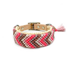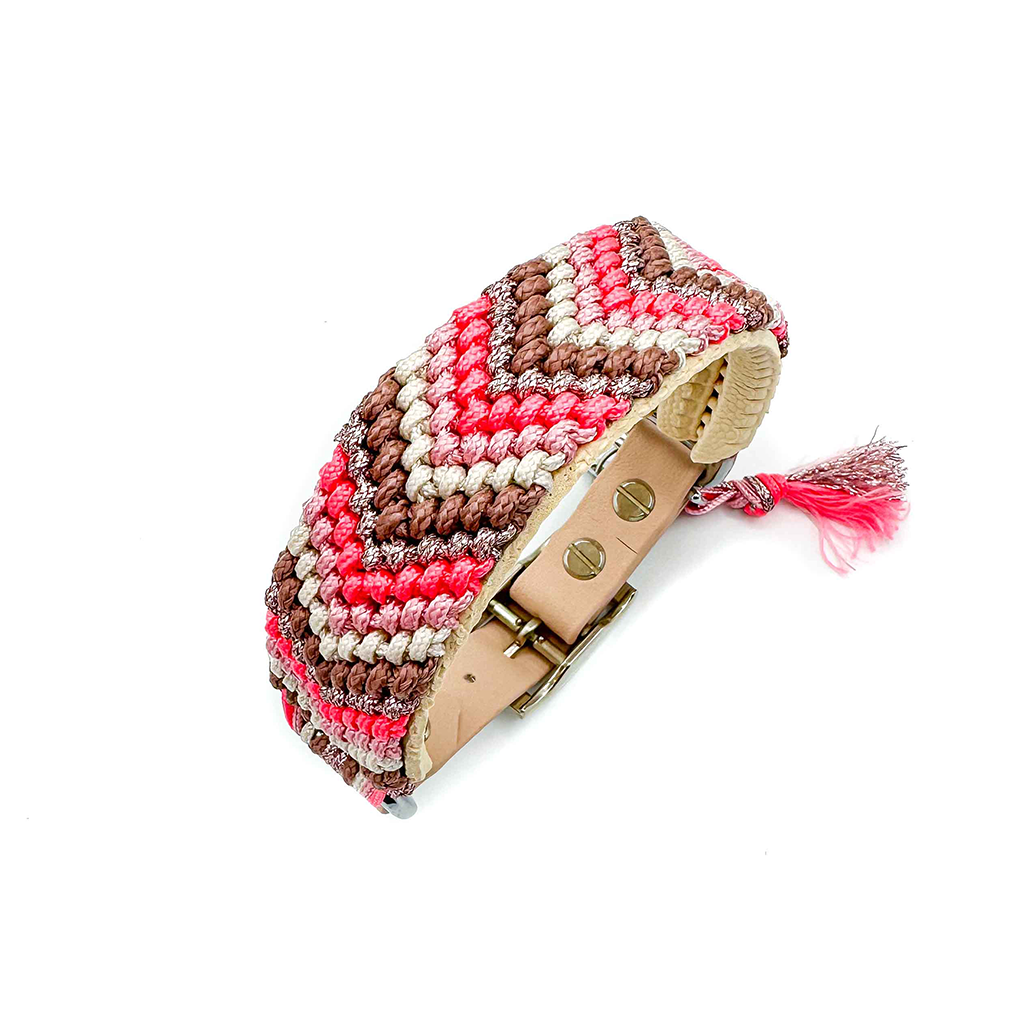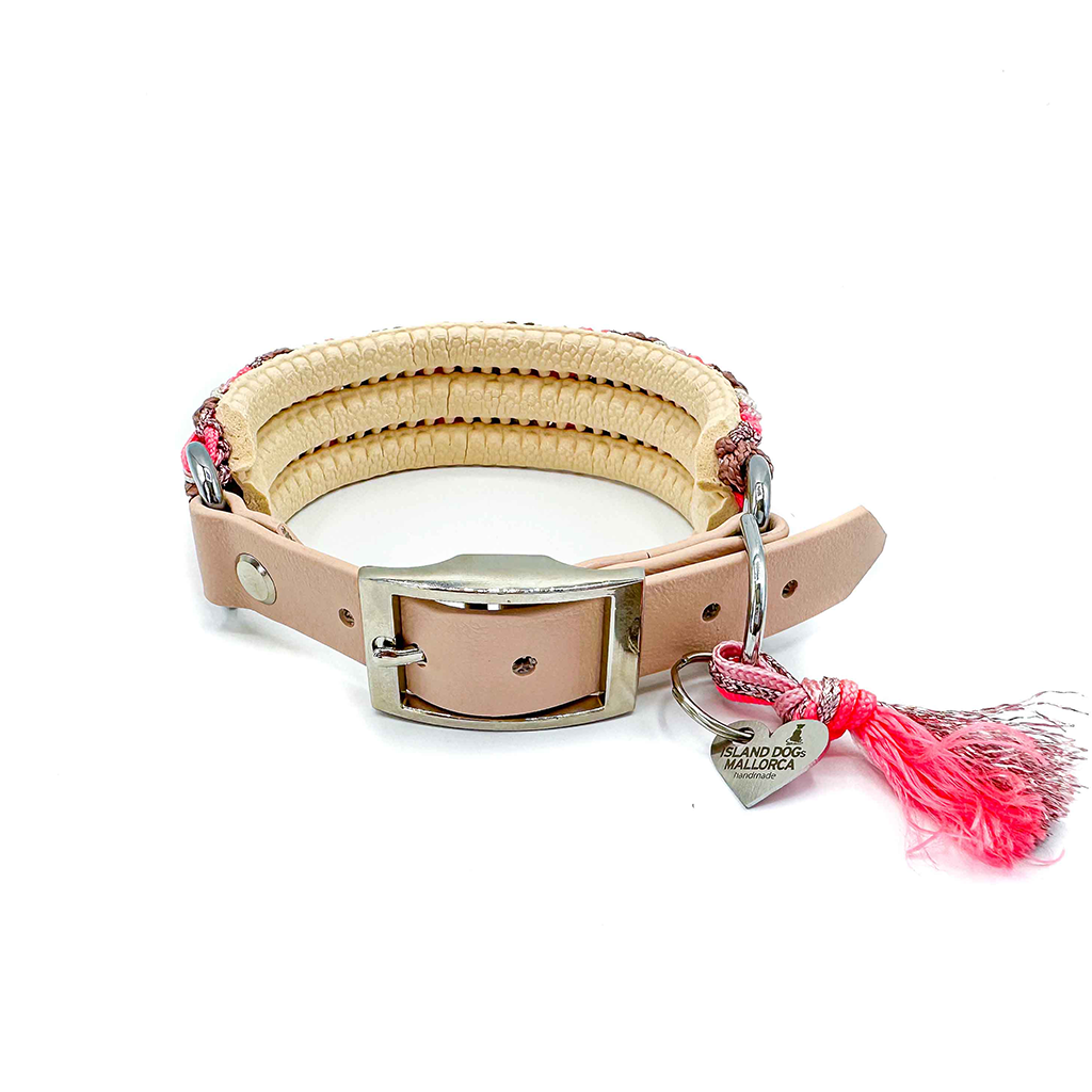 Das Halsband auf dem Bild hat eine Breite von 3 cm und besteht aus hangeknüpften Paracordbandmuster in Pfeiloptik. Insgesamt wurden hier die 5 Farben Kupfer Rosa, Cream, Lachs Rosa, Pastell Rosa und Glitzer Rose verarbeitet. Zusätzlich wurde das Halsband mit einer super weichen Polsterung in der Farbe Cream unterlegt und bietet so einen super angenehm Tragekomfort. Wenn du eine Leine wählst, passen wir diese farblich dem Halsband an und die Optik der Leine ist wie die unserer Tau Designs.