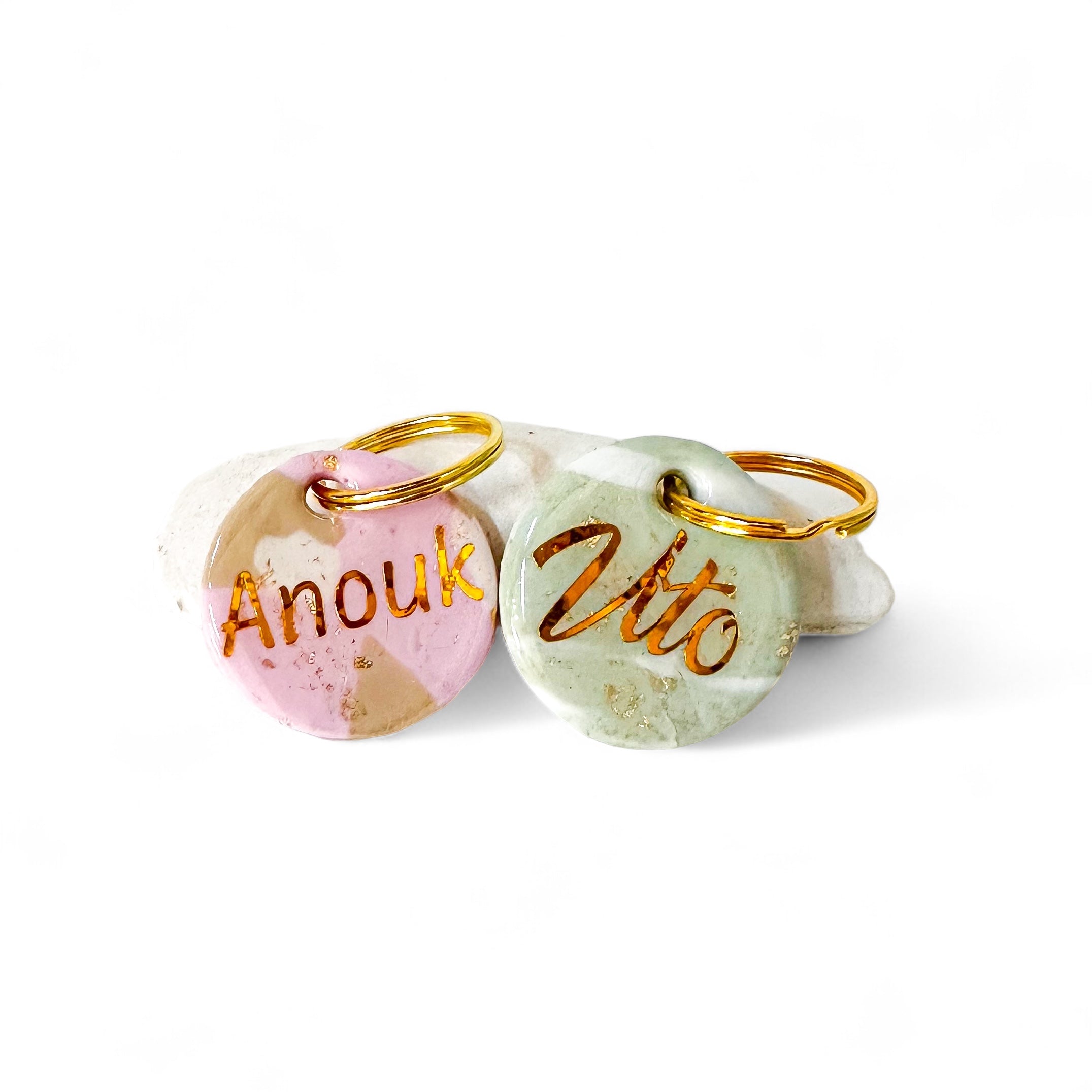 Die Hundemarken werden vorne und hinten mit dem Namen deines und Hundes und deiner Telefonnummer versehen. Die Schrift besteht immer aus goldener Folie.