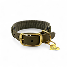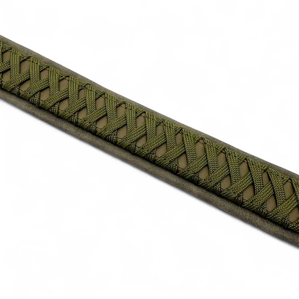 Das Halsband auf dem Bild besteht aus Biothane in der Farbe Olive und wurde mit Paracordand im im Felchtmuster verziert. Das Halsband ist außerdem mit einer weichen Kunstlederpolsterung in Dunkelgrün versehen und ermöglicht so einen super angenehmen Tragekomfort für deinen Hund. Paracord, Biothane und Polsterung sind komplett vernäht. Als Verschluss ist eine Doppelstegschnalle angebracht die das Halsband mehrfach verstellbar macht.