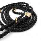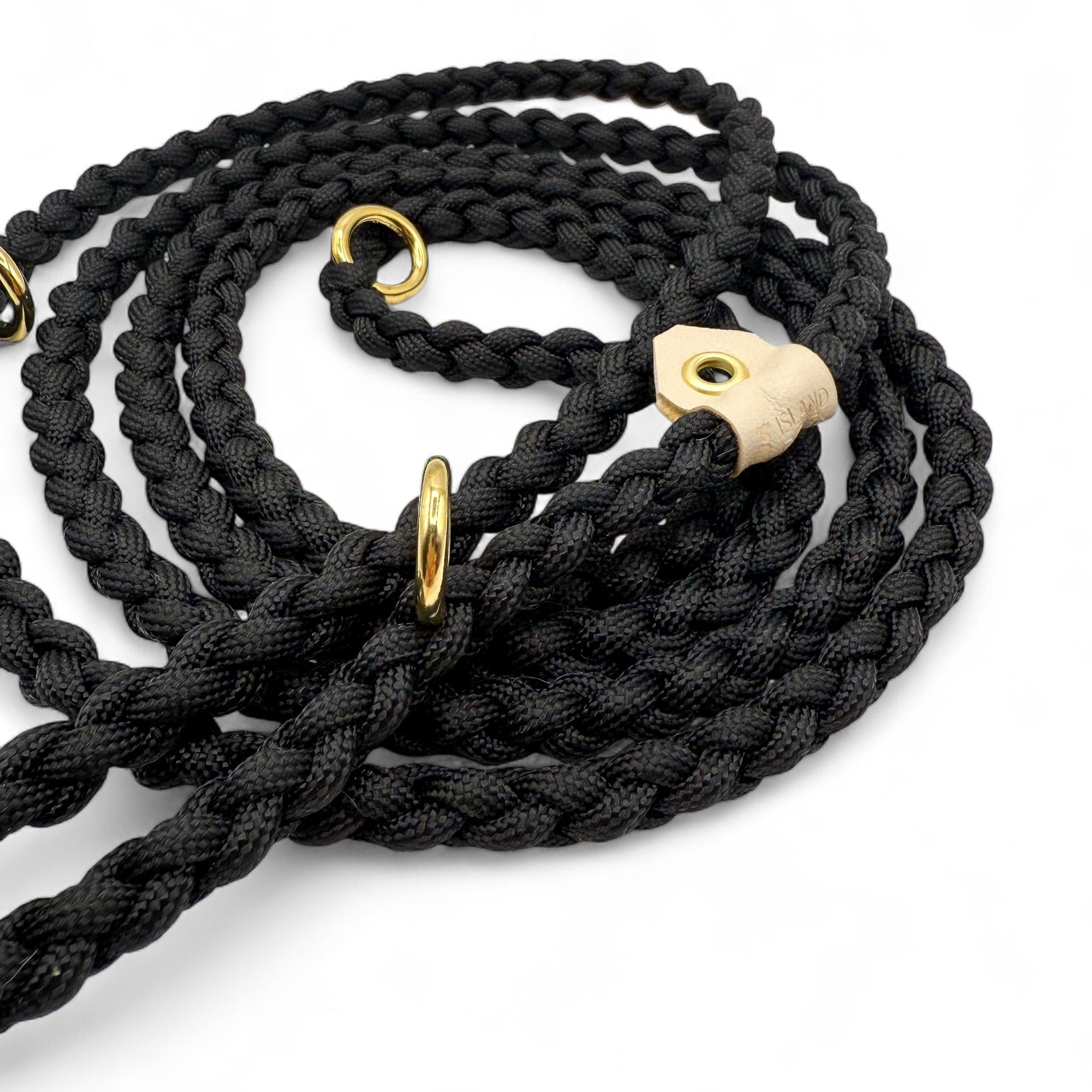 Die Leine auf dem Bild besteht rundegeflochtenem Paracord in der Farbe Schwarz und hat eine Standardlänge von 220 cm und ist 3 fach verstellbar. An den Enden wurde sie Leine mit einem speziellen Knoten versehen.