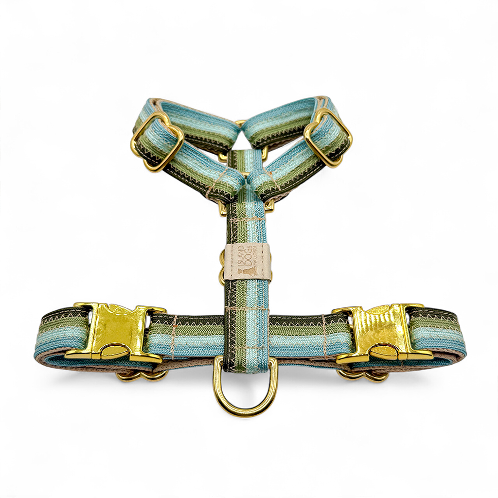 Das Geschirr auf dem Bild besteht aus Paracordband in den Farben Army Green, Guacamole, Mojito und Glacier Blau. Die Paracordbänder wurden mit einer Zickzack Naht zusammengenäht und das Halsband zusätzlich mit Gurtband unterlegt und verstärkt. Als Schließe wurden zwei Klickverschlüsse verarbeitet und Geschirr ist stufenlos an Bauch, Brust und untersteg verstellbar.