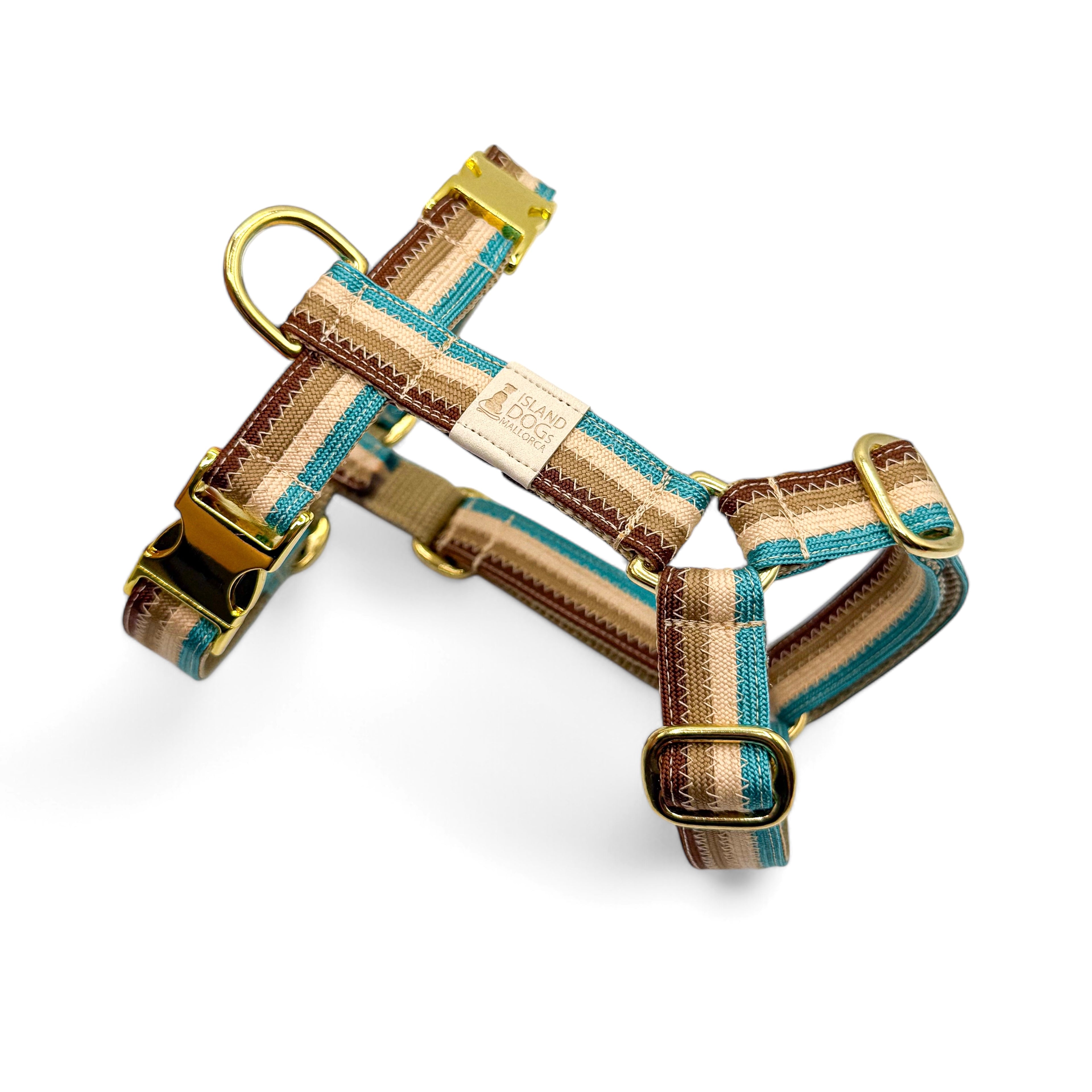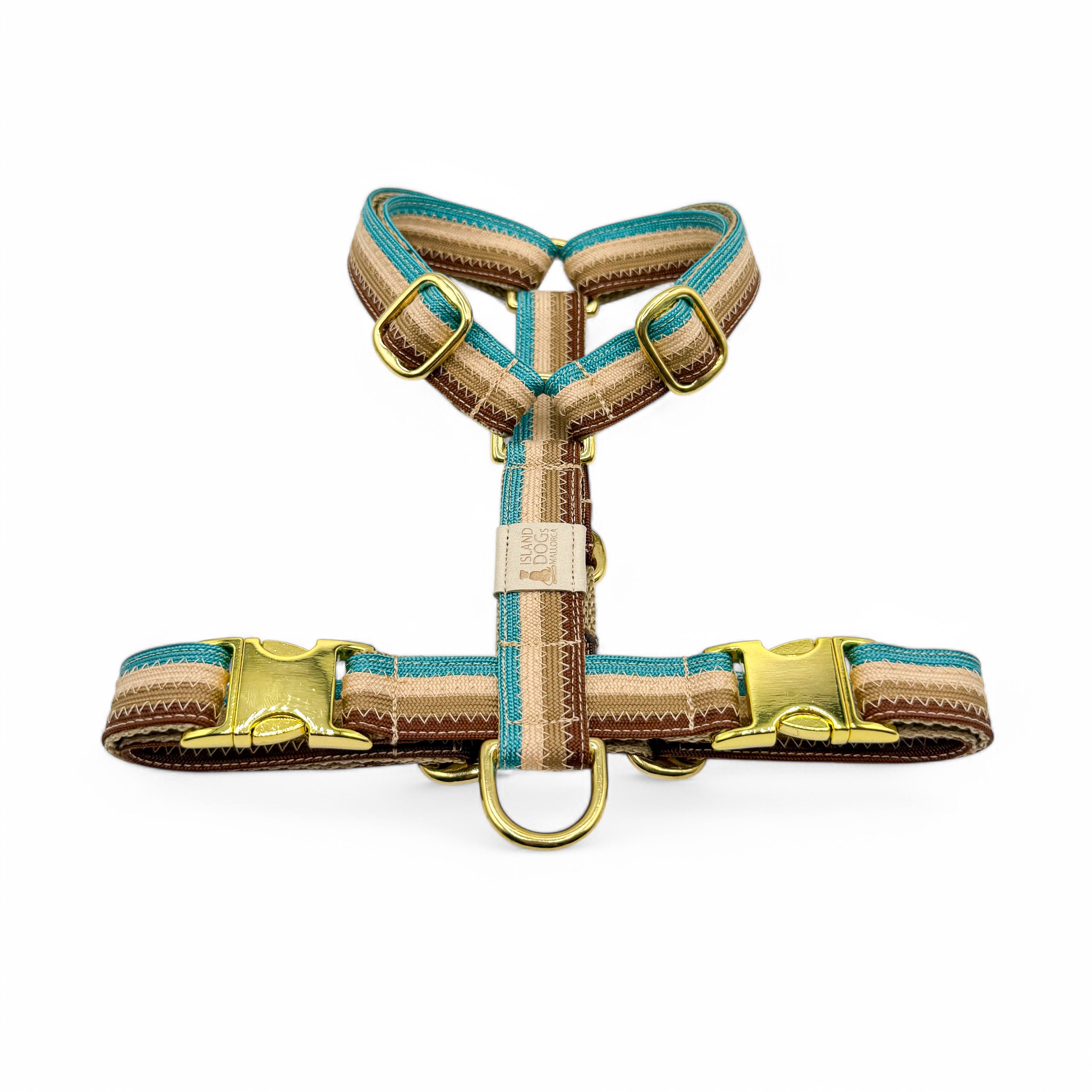 Das Geschirr auf dem Bild besteht aus Paracordband in den Farben Chocolate Braun, Sahara Braun, Casablanca und Turquoise. Die Paracordbänder wurden mit einer Zickzack Naht zusammengenäht und das Halsband zusätzlich mit Gurtband unterlegt und verstärkt. Als Schließe wurden zwei Klickverschlüsse verarbeitet und Geschirr ist stufenlos an Bauch, Brust und untersteg verstellbar.