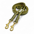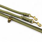 Die Leine auf dem Bild besteht aus Paracordband in den Farben Army Grüm, Gucamole, Moss und Green Pepper. Die Paracordbänder wurden mit einer Zickzack Naht zusammengenäht und durch den angebrachten Schieber ist die Leine auf der ganzen Länge stufenlos verstellbar.