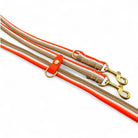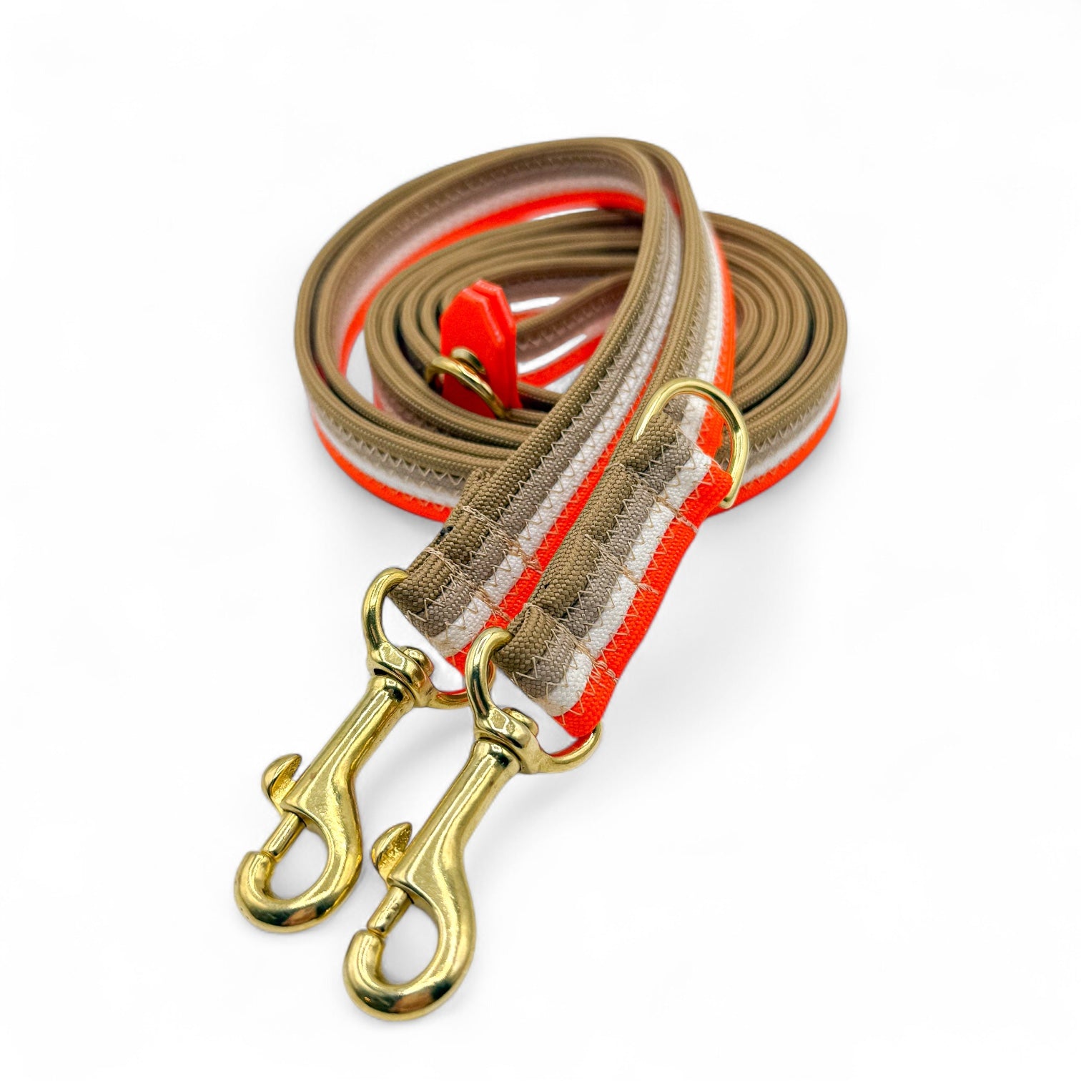 Die Leine auf dem Bild besteht aus Paracordband in den Farben Sahara Braun, Mocca, Weiss und Neon Orange Rosa. Die Paracordbänder wurden mit einer Zickzack Naht zusammengenäht und durch den angebrachten Schieber ist die Leine auf der ganzen Länge stufenlos verstellbar.