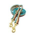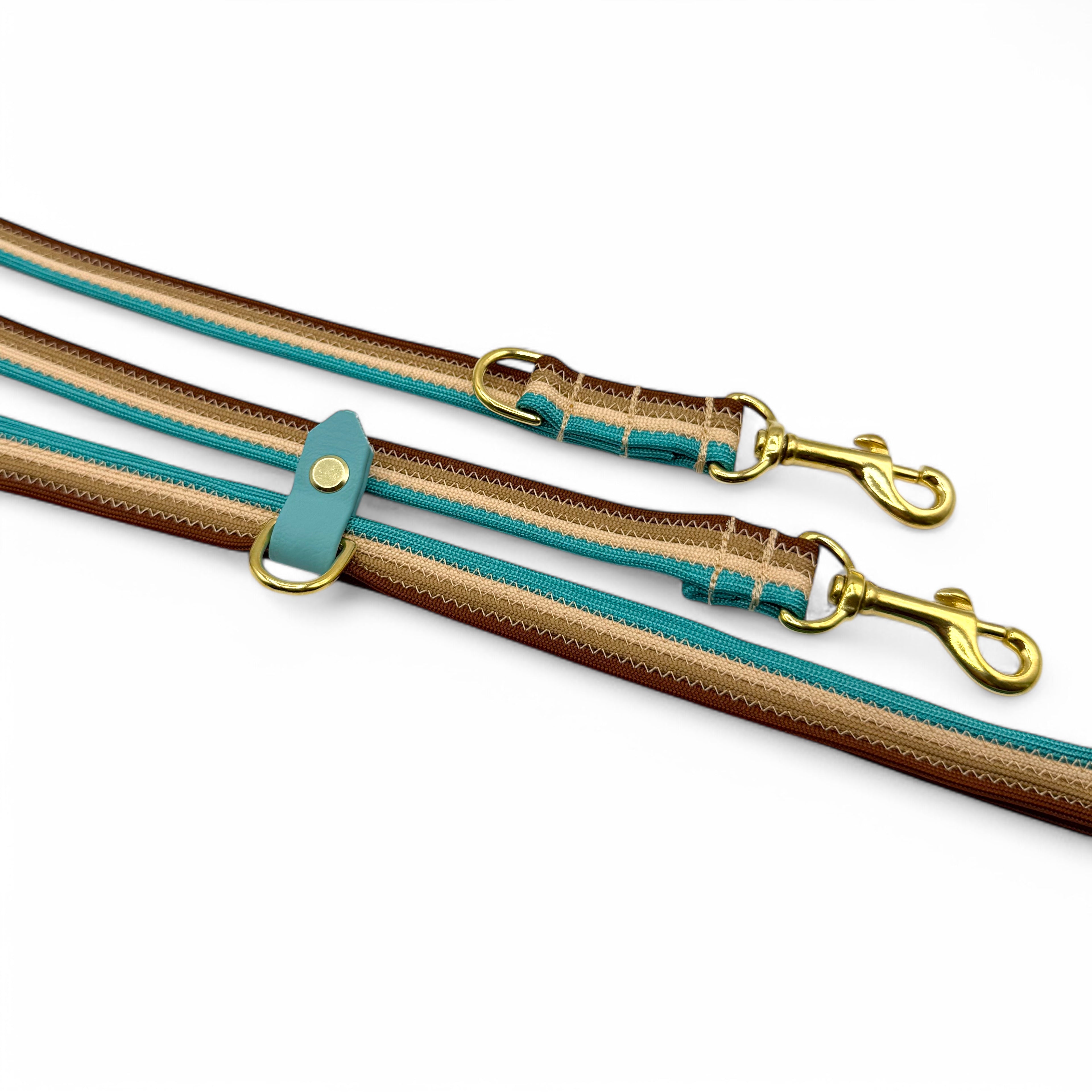 Die Leine auf dem Bild besteht aus Paracordband in den Farben Chocolate Braun, Sahara Braun, Casablanca und Turquoise. Die Paracordbänder wurden mit einer Zickzack Naht zusammengenäht und durch den angebrachten Schieber ist die Leine auf der ganzen Länge stufenlos verstellbar.