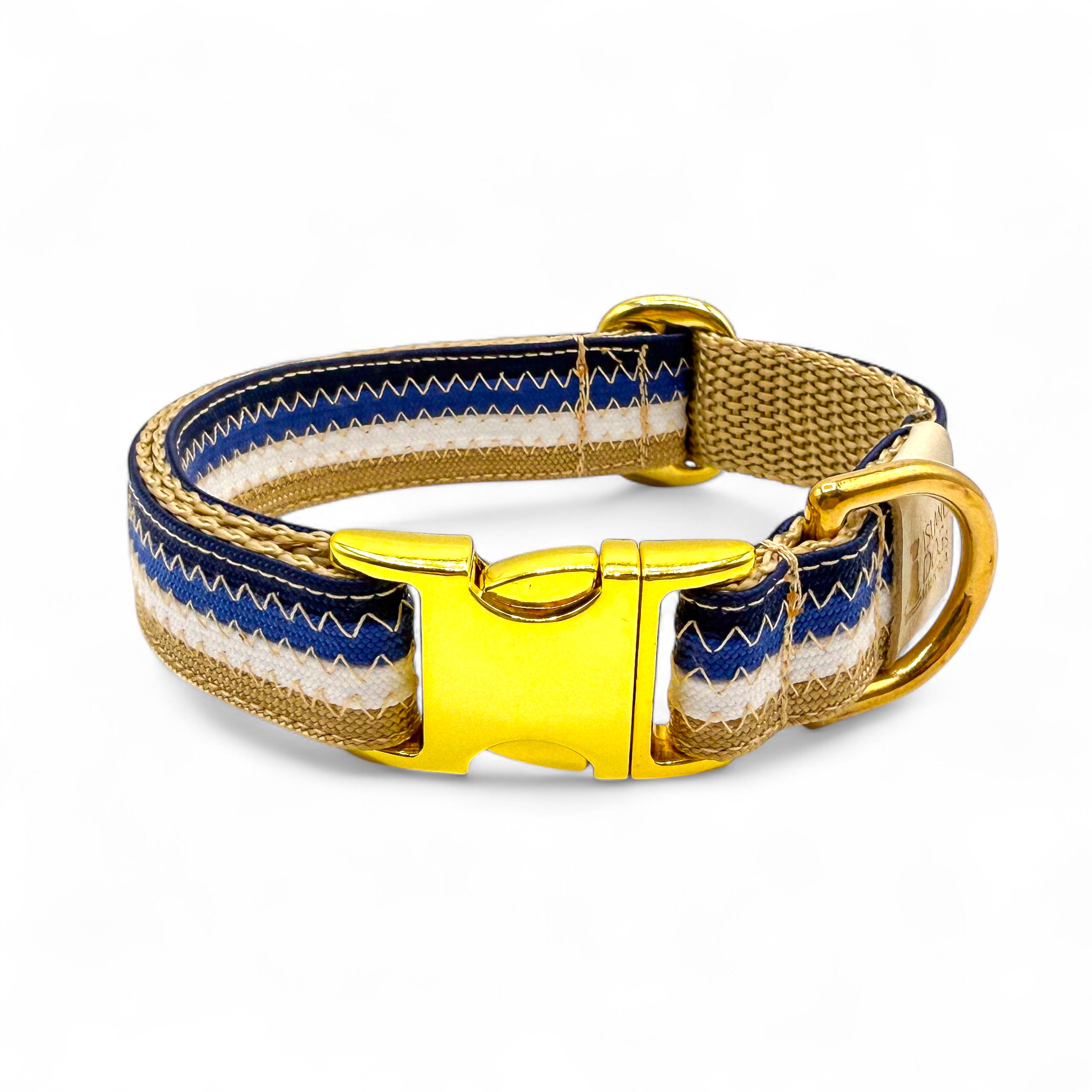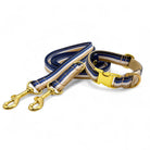 Das Set auf dem Bild besteht aus Paracordband in den Farben Midnight Blue Indigo, Weiss und Golden Grain. Die Paracordbänder wurden mit einer Zickzack Naht zusammengenäht und das Halsband zuätzlich mit Gurtband unterlegt und verstärkt. Als Schließe wurde ein Klickverschluss verarbeitet und das Halsband ist stufenlos verstellbar. Die Leine des Sets hat eine Länge von 2,20 m und ist durch den angebrachten Schieber auf der ganzen Länge stufenlos verstellbar.