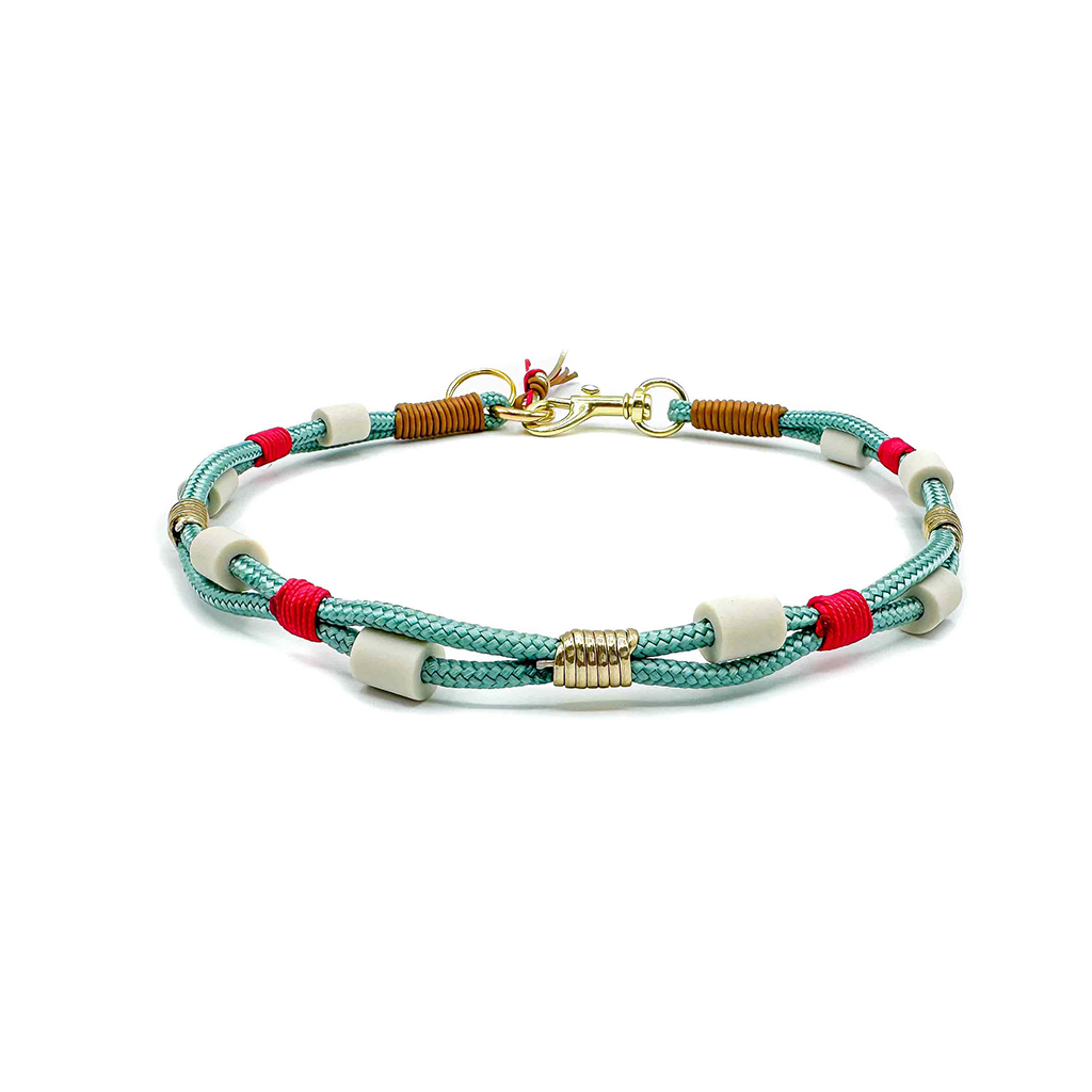 Farbe & Material: PPM Tau in Sea Green, Paracordband in Beere, Kunstlederband in Gold und Lederband in Cognac