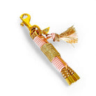 Dieser Schlüsselanhänger besteht aus 8 mm dickem Tau in der Farbe Beige und wurde mit Paracordband in der Farbe Pastell Rosa und Kunstlederband in der Farbe Gold verziert.