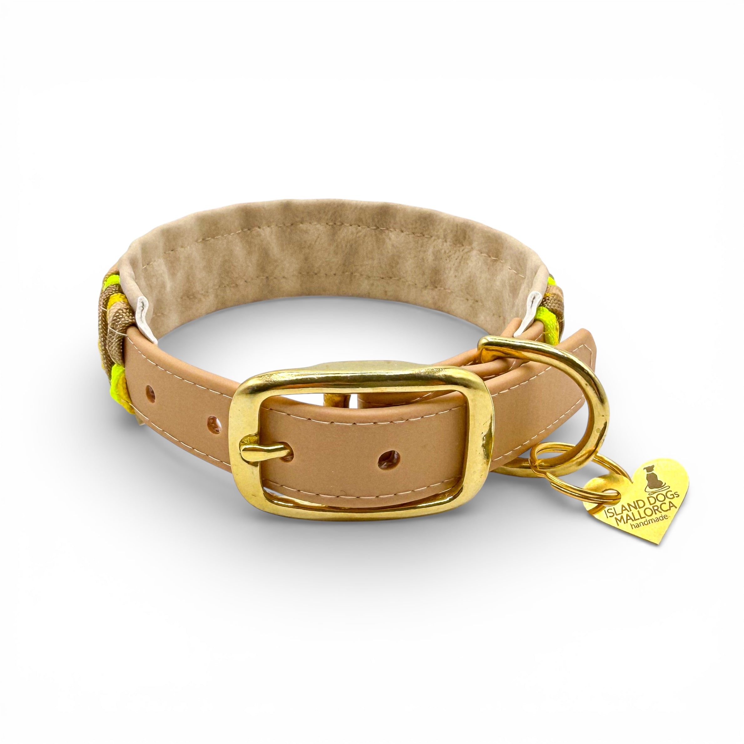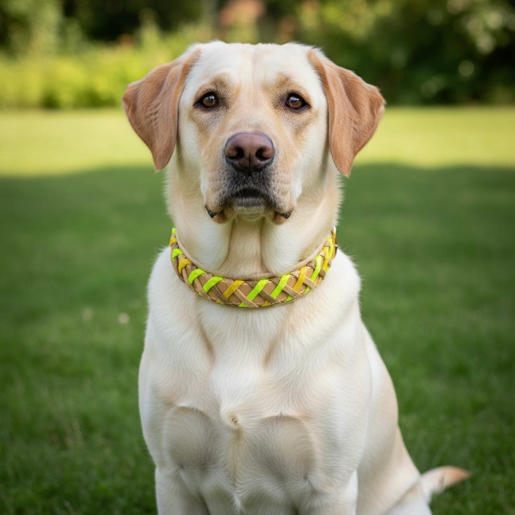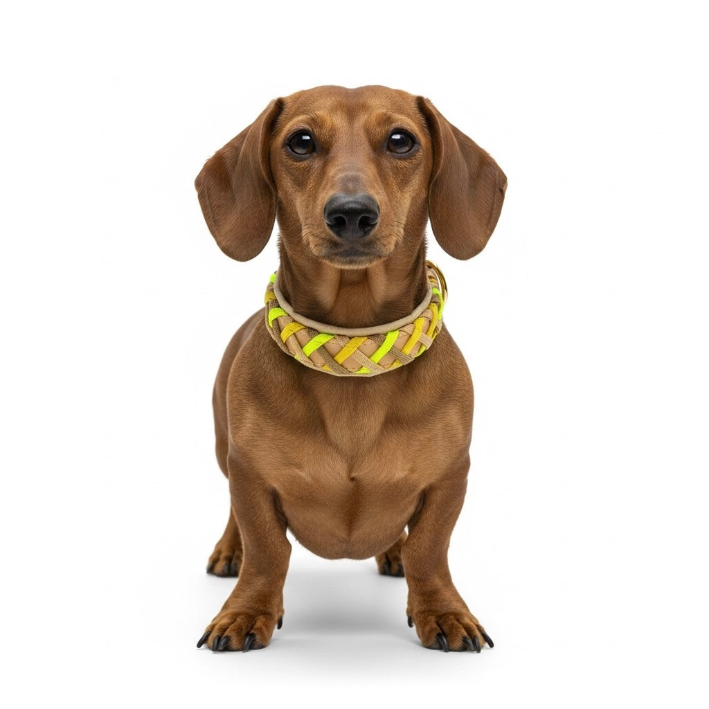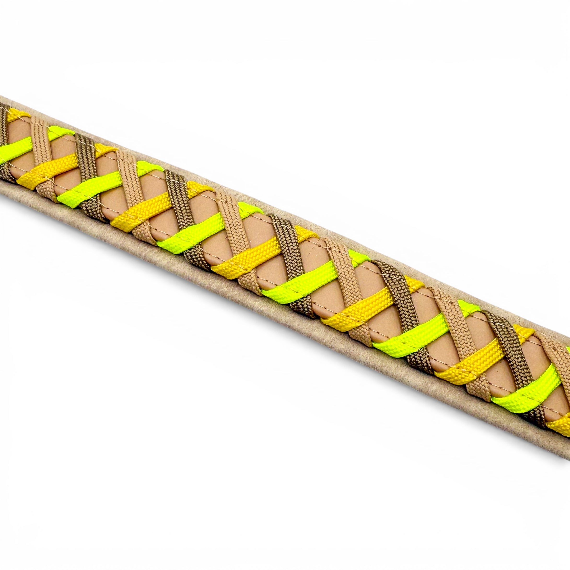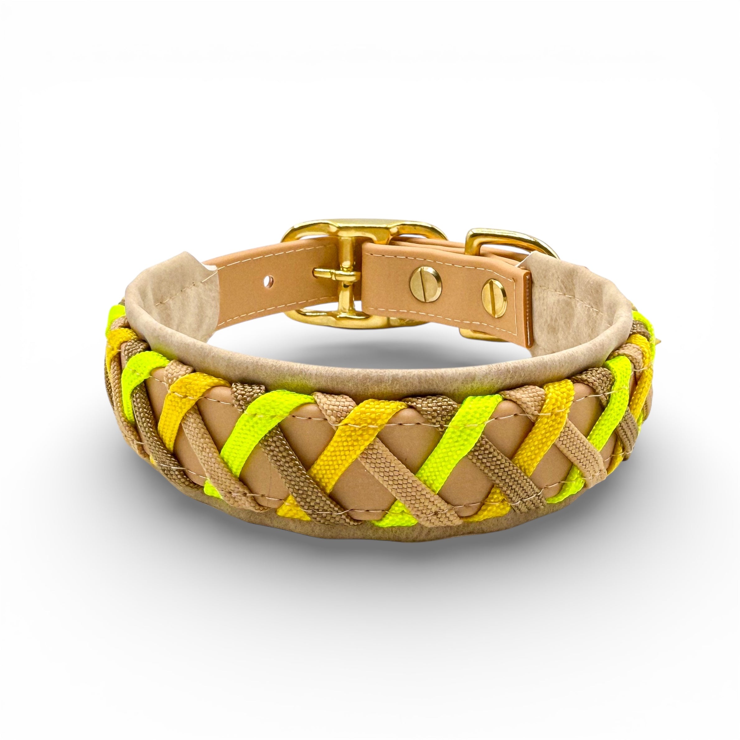 Das Halsband auf dem Bild besteht aus Biothane in den Farben Neon Gelb, Sunflower, Casablanca und Goldbraun und wurde mit Paracordand im im Felchtmuster verziert. Das Halsband ist außerdem mit einer weichen Kunstlederpolsterung in Creme versehen und ermöglicht so einen super angenehmen Tragekomfort für deinen Hund. Paracord, Biothane und Polsterung sind komplett vernäht. Als Verschluss ist eine Doppelstegschnalle angebracht die das Halsband mehrfach verstellbar macht.