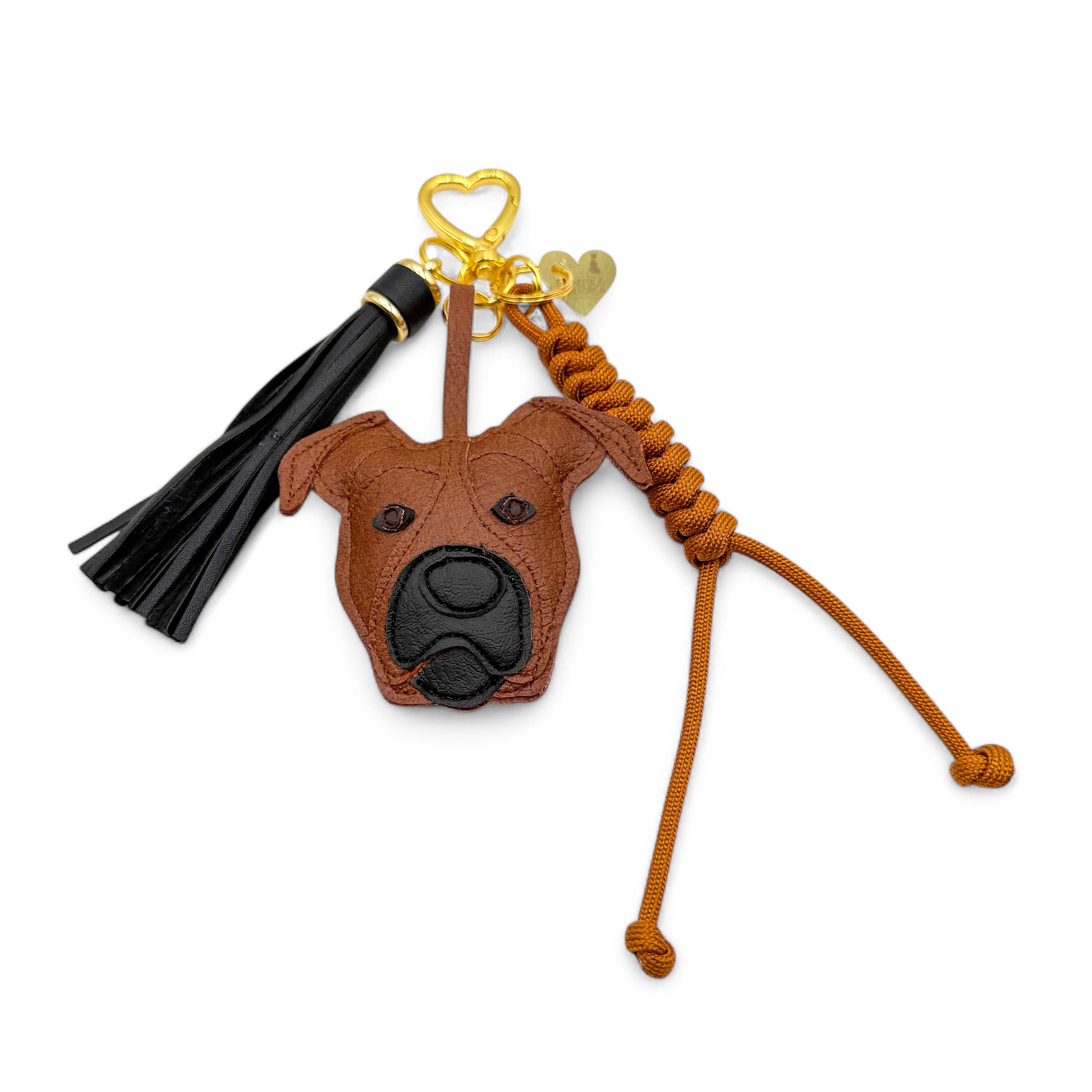 Dieser stylische Taschenanhänger besteht aus Amstaff Hundekopf, einer Quaste in Schwarz , einem Paracordanhänger in Bronze und einem Herzkarabiner an dem alle Einzelteile befetigt sind.