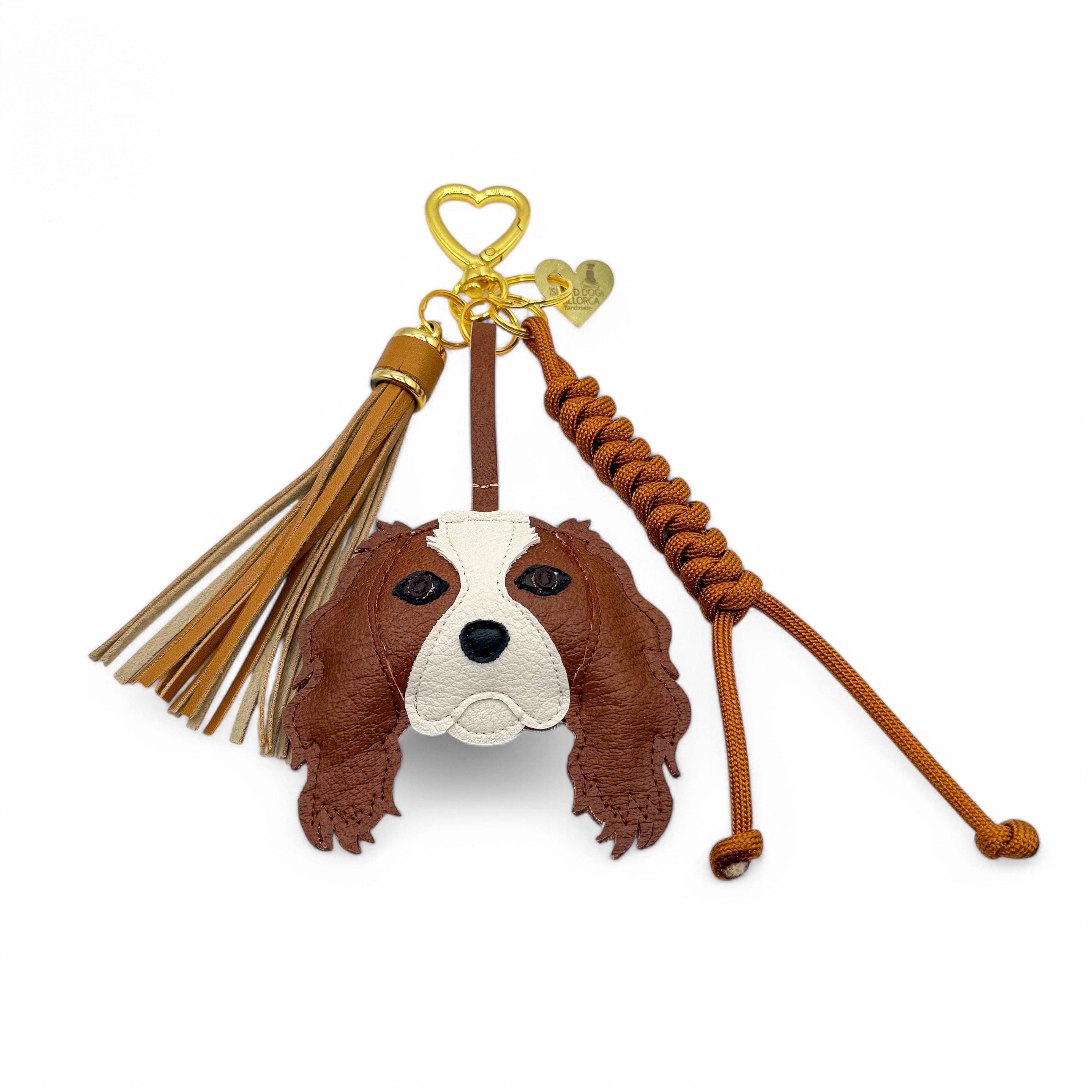 Dieser stylische Taschenanhänger besteht aus Cavalier King Spaniel Hundekopf in, einer Quaste in Cognac, einem Paracordanhänger in Bronze und einem Herzkarabiner an dem alle Einzelteile befetigt sind.