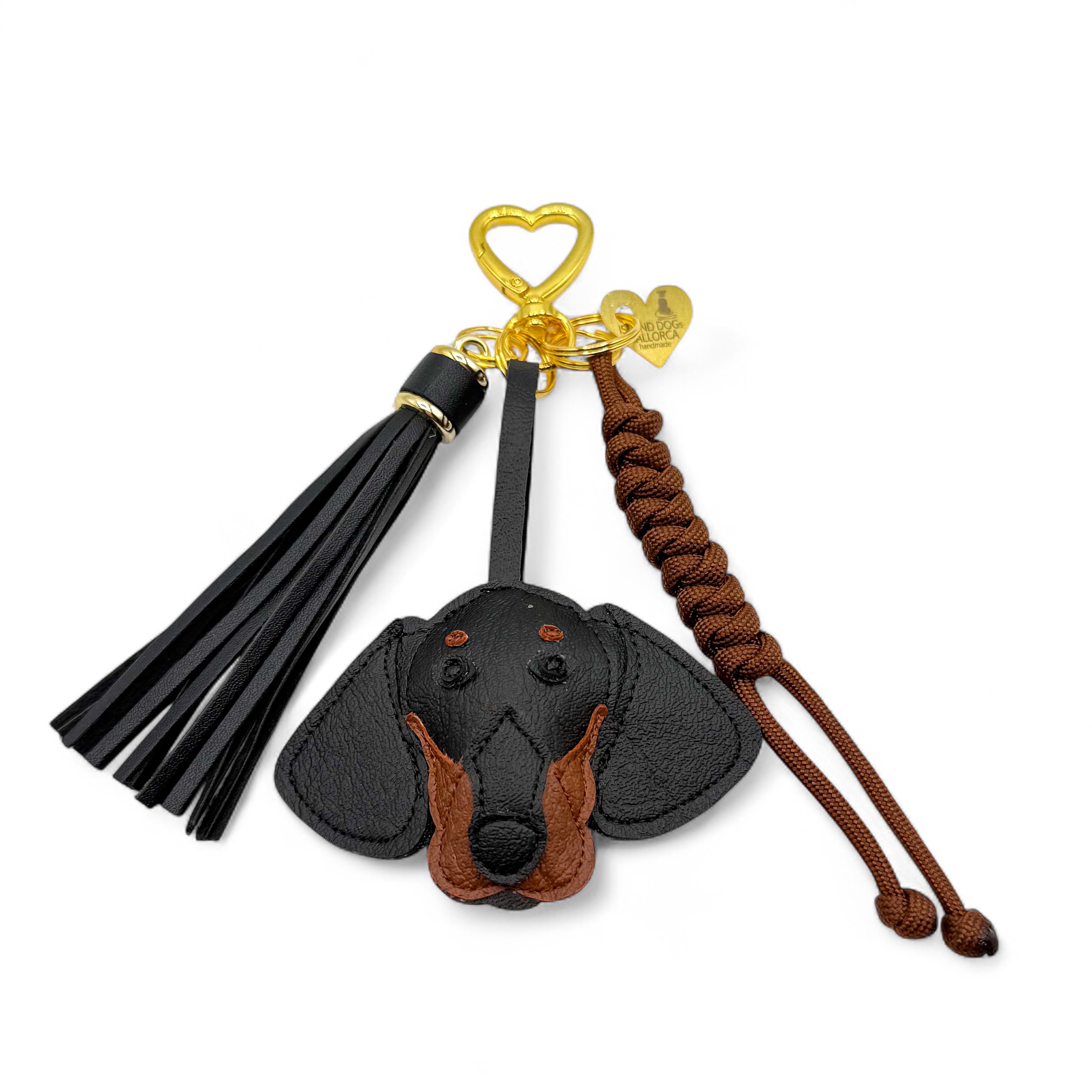 Dieser stylische Taschenanhänger besteht aus Dackel Hundekopf, einer Quaste in Schwarz, einem Paracordanhänger in Braun und einem Herzkarabiner an dem alle Einzelteile befetigt sind.
