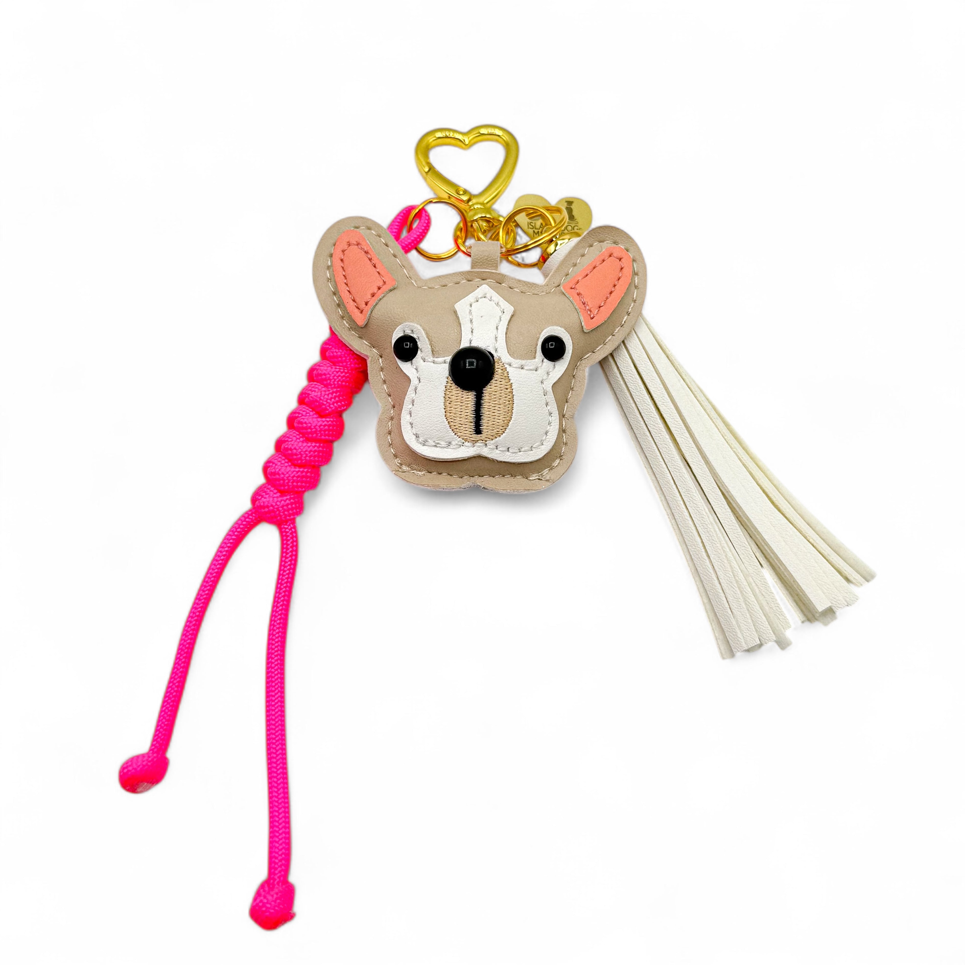 Dieser stylische Taschenanhänger besteht aus einer French Bulldog aus Leder in Creme, einer Quaste in weiß, einem Paracordanhänger in Neon Pink und einem Herzkarabiner an dem alle einzelteile befetigt sind.