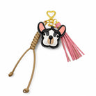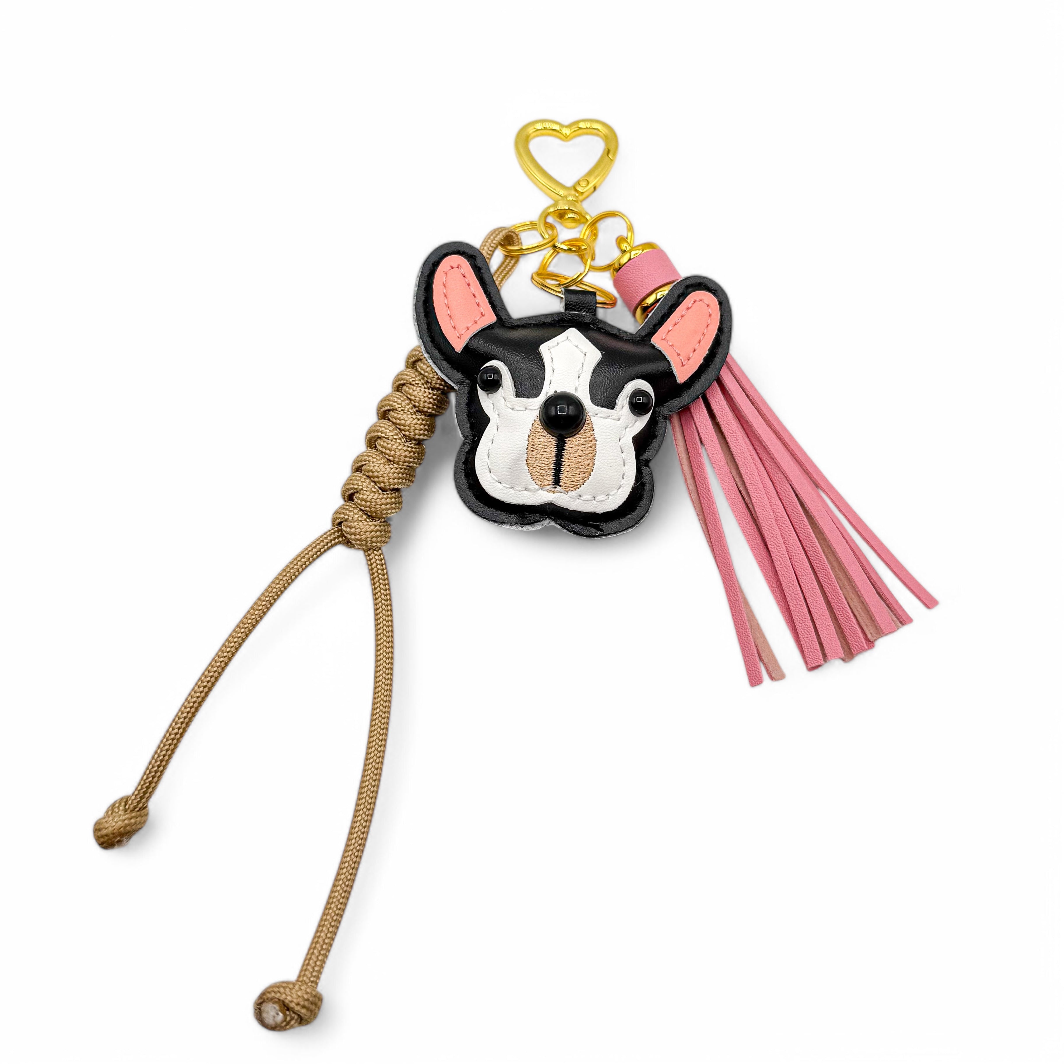 Dieser stylische Taschenanhänger besteht aus einer French Bulldog aus Leder in Schwarz, einer Quaste in Rosa, einem Paracordanhänger in Goldbraun und einem Herzkarabiner an dem alle einzelteile befetigt sind.