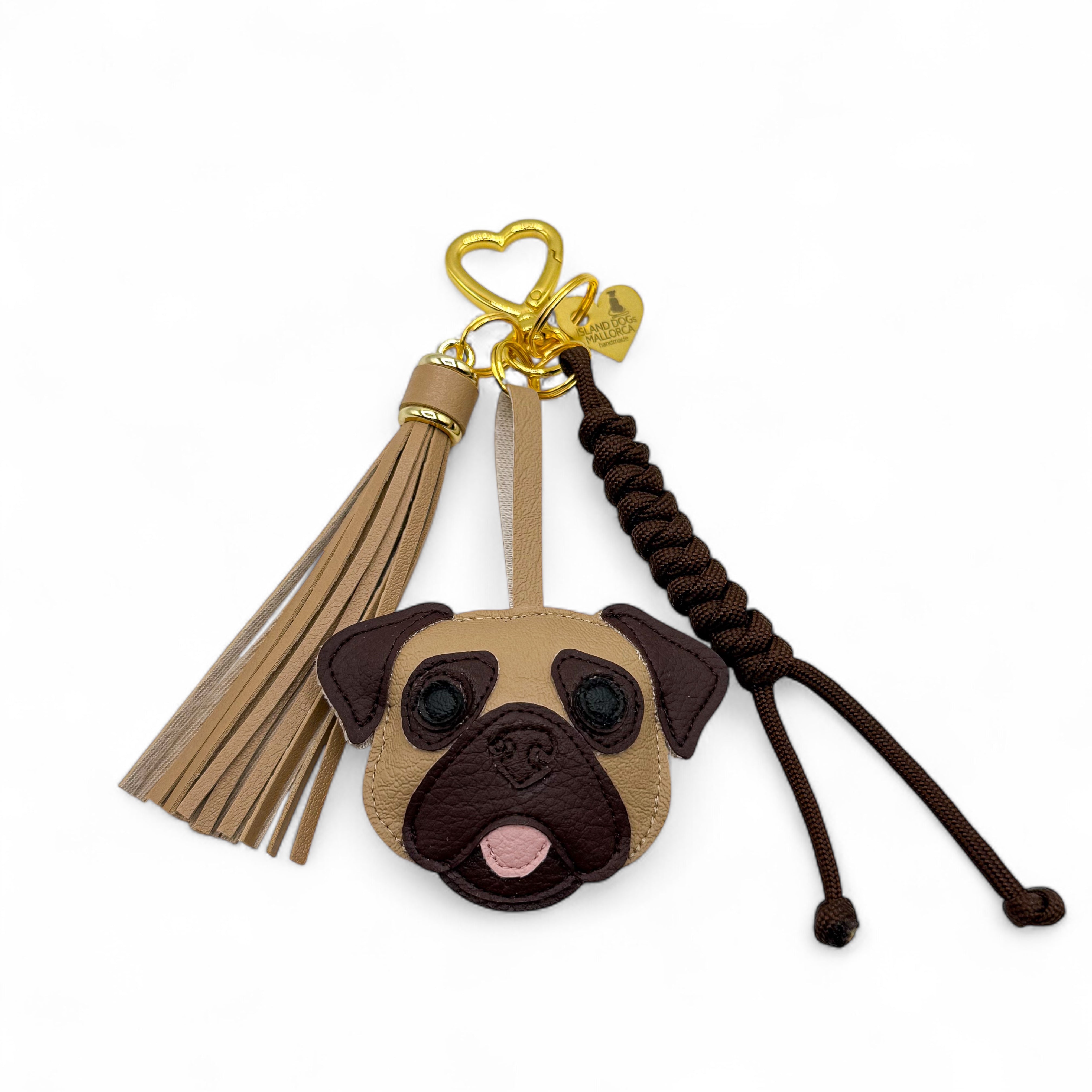 Dieser stylische Taschenanhänger besteht aus Mops Hundekopf, einer Quaste in Beige, einem Paracordanhänger in Braun und einem Herzkarabiner an dem alle Einzelteile befetigt sind.