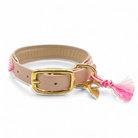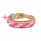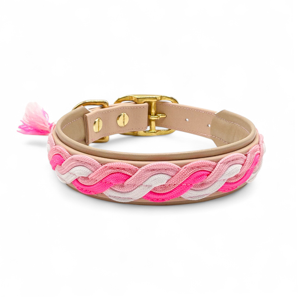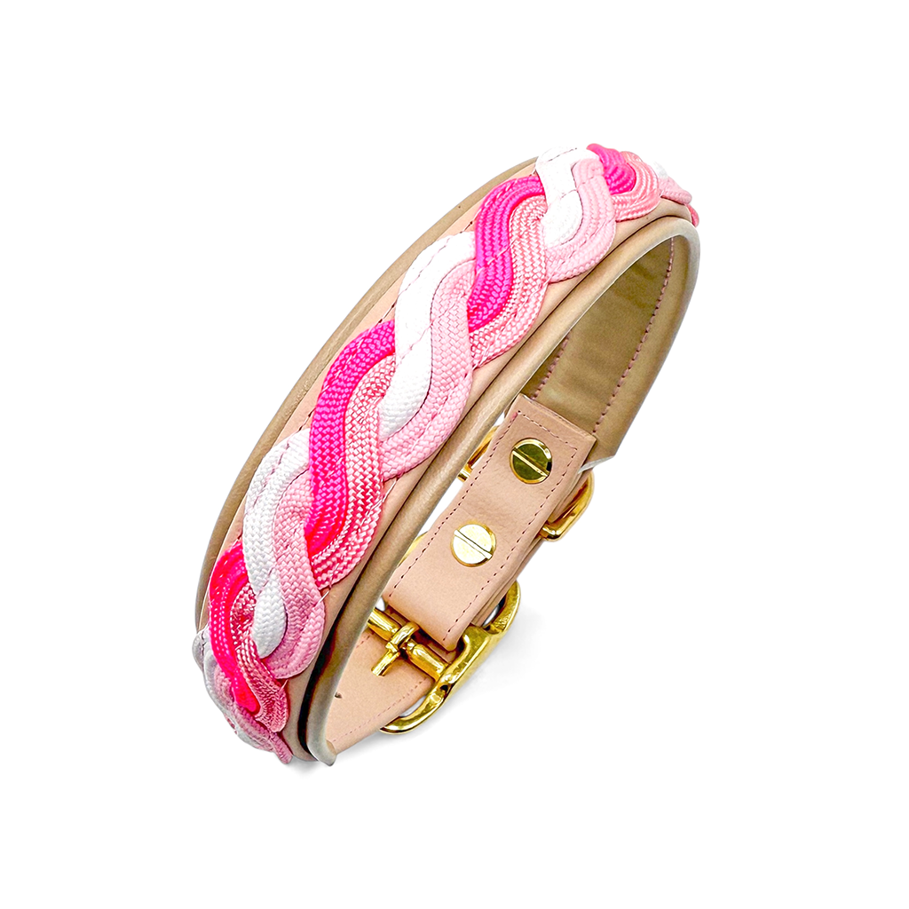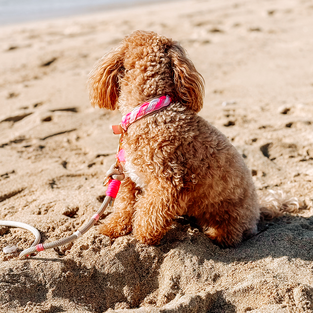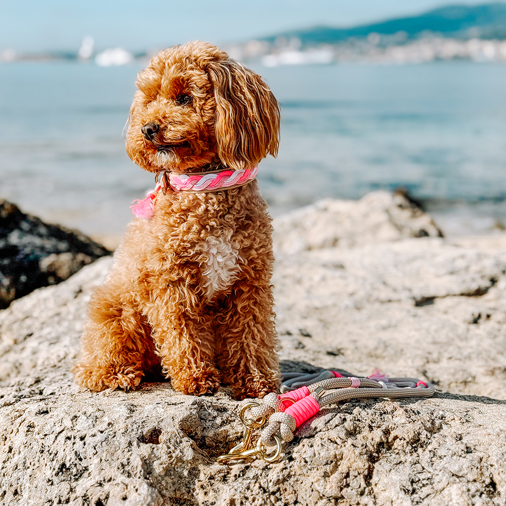 Das Halsband auf dem Bild besteht aus Biothane in der Farbe Creme und wurde mit Paracordand im Wave Look verziert. Das Halsband ist außerdem mit einer weichen Kunstlederpolsterung in Beige versehen und ermöglicht so einen super angenehmen Tragekomfort für deinen Hund. Paracord, Biothane und Polsterung sind komplett vernäht. Als Verschluss ist eine Doppelstegschnalle angebracht die das Halsband mehrfach verstellbar macht.