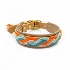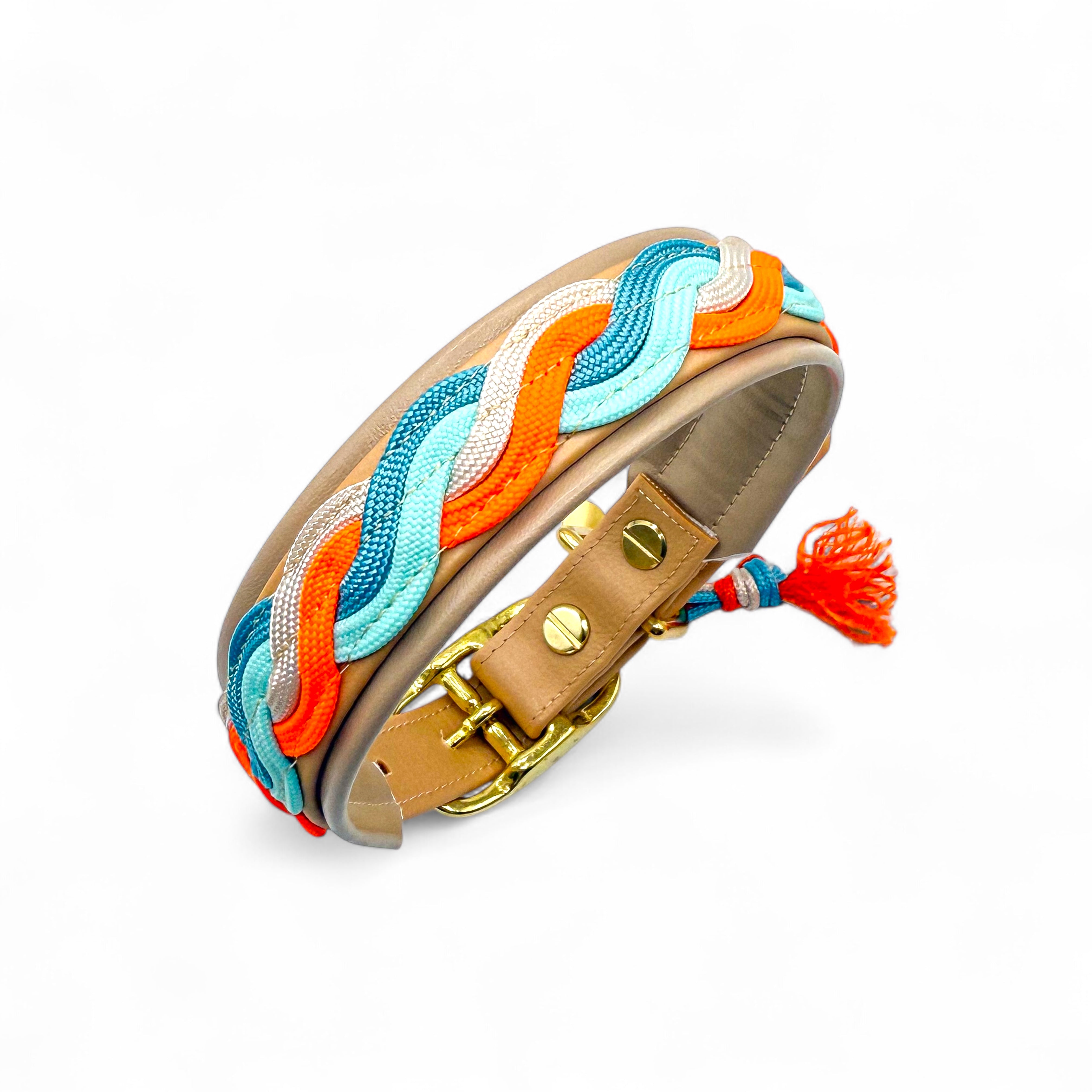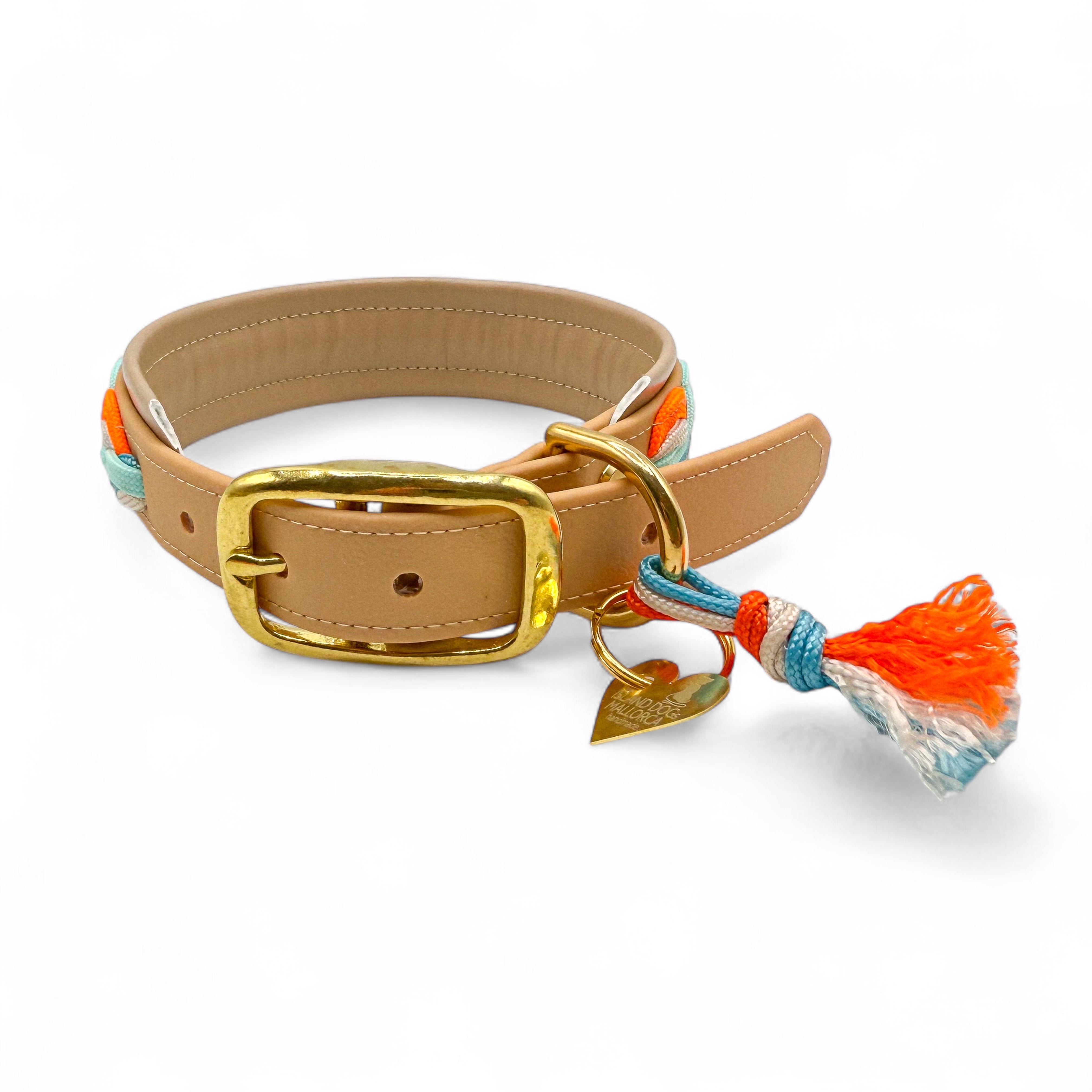 Das Halsband auf dem Bild besteht aus Biothane in der Farbe Light Gold und wurde mit Paracordand im Wave Look verziert. Das Halsband ist außerdem mit einer weichen Kunstlederpolsterung in Beige versehen und ermöglicht so einen super angenehmen Tragekomfort für deinen Hund. Paracord, Biothane und Polsterung sind komplett vernäht. Als Verschluss ist eine Doppelstegschnalle angebracht die das Halsband mehrfach verstellbar macht.