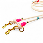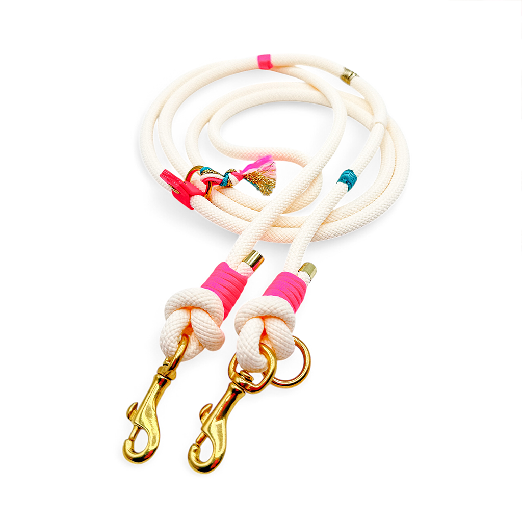 Die Leine auf dem Bild besteht aus speziellem Nylon Tau in der Farbe Sahne das eine tolle und weiche Haptik hat. An den Enden wurde die Leine mit einem speziellen und stylischen Knoten versehen und mit Paracordband in der Farbe Neon Pink verziert. Außerdem wiederholen sich die Farben des Halsbandes in kleinen Apkliationen an der Leine und verleihen ihr so einen schicken und edlen Look. Die Leine hat einen festen Ring für die kürzeste Einstellung und einen Schieber der mit einem D-Ring versehen wurde, den ihr auf der ganzen Leine stufenlos verschieben und eure Wunschlänge einstellen könnt.