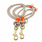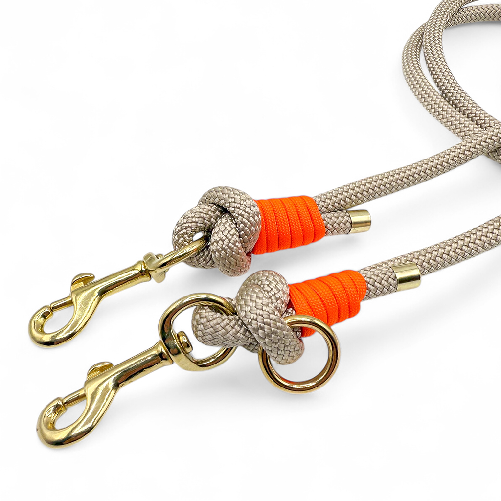 Die Leine auf dem Bild besteht aus speziellem Nylon Tau in der Farbe Cafe Latte das eine tolle und weiche Haptik hat. An den Enden wurde die Leine mit einem speziellen und stylischen Knoten versehen und mit Paracordband in der Farbe Neon Orange verziert. Außerdem wiederholen sich die Farben des Halsbandes in kleinen Apkliationen an der Leine und verleihen ihr so einen schicken und edlen Look. Die Leine hat einen festen Ring für die kürzeste Einstellung und einen Schieber der mit einem D-Ring versehen wurde, den ihr auf der ganzen Leine stufenlos verschieben und eure Wunschlänge einstellen könnt.
