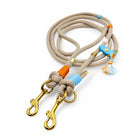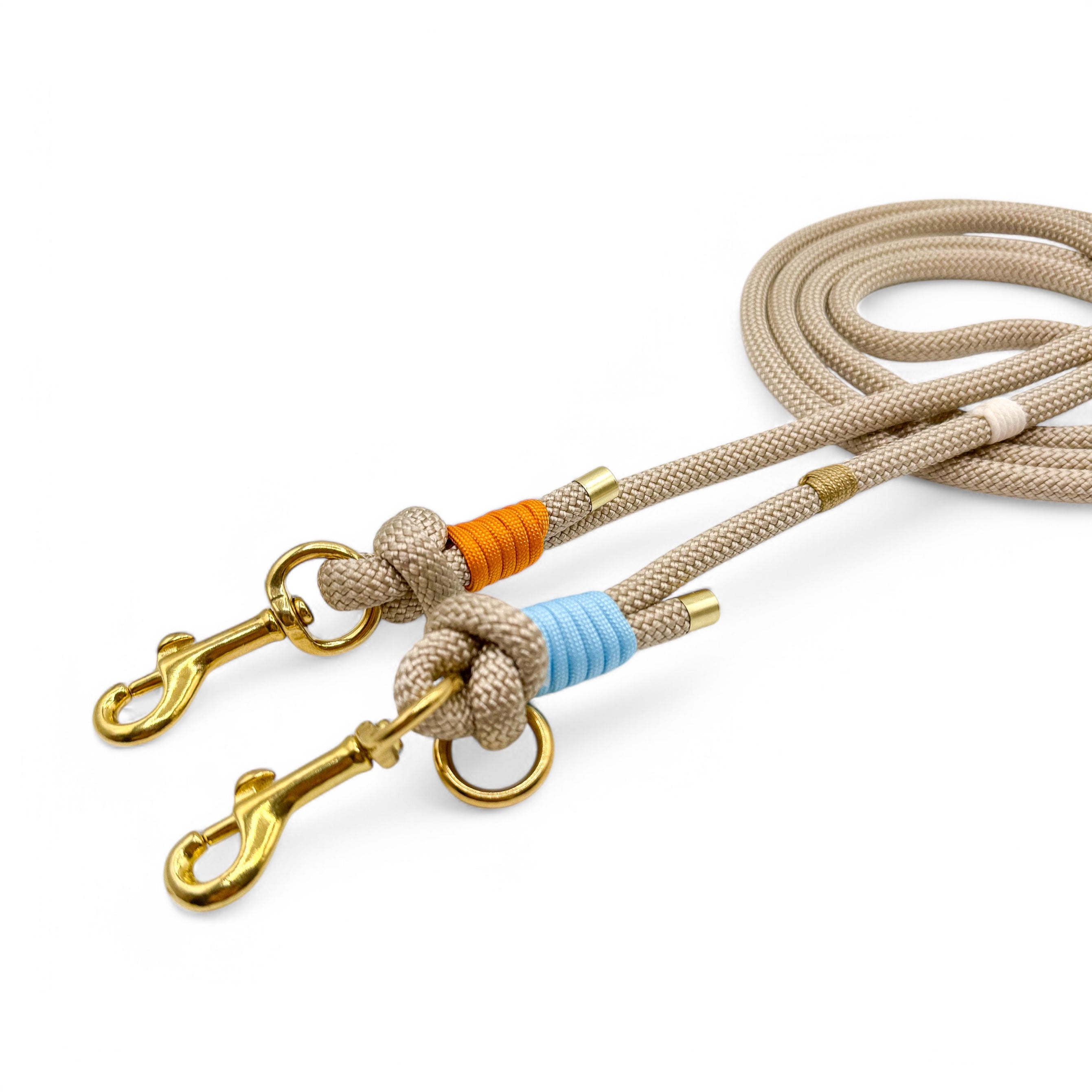 Die Leine auf dem Bild besteht aus speziellem Nylon Tau in der Farbe Cafe Latte das eine tolle und weiche Haptik hat. An den Enden wurde die Leine mit einem speziellen und stylischen Knoten versehen und mit Paracordband in der Farbe Apricot Orange und Cotton Candy Blau verziert. Außerdem wiederholen sich die Farben des Halsbandes in kleinen Apkliationen an der Leine und verleihen ihr so einen schicken und edlen Look. Die Leine hat einen festen Ring für die kürzeste Einstellung und einen Schieber der mit einem D-Ring versehen wurde, den ihr auf der ganzen Leine stufenlos verschieben und eure Wunschlänge einstellen könnt.